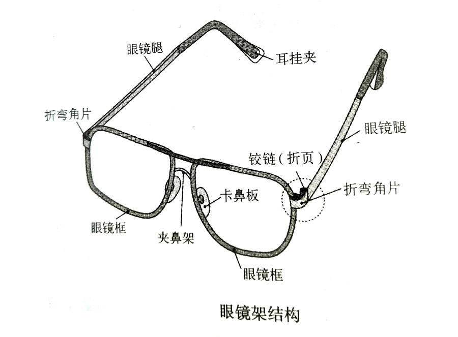 鈦制眼鏡架出現(xiàn)在市場上是20世紀(jì)80年代初期,目前作為金屬制原材料,它已占據(jù)了牢固而不動(dòng)搖的地位。這是由于鈦具備了比強(qiáng)度高(質(zhì)輕而堅(jiān)韌)、耐腐蝕性優(yōu)良、生物相容性很好等優(yōu)點(diǎn)而形成的,下圖為眼鏡架結(jié)構(gòu)。眼鏡架的部件加工技術(shù)如下。