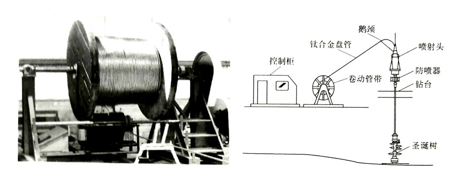井下作業(yè)流送管通常采用Grade2、Grade7、Grade9、Grade12、Grade18、Grade28等六種鈦及鈦合金焊接盤管制造,目前的最大外徑為63.5mm,最小壁厚為3.2mm,盤管長(zhǎng)度可達(dá)1630~3050m。據(jù)報(bào)道,未來盤管的目標(biāo)外徑希望達(dá)到152mm。使用鈦合金盤管代替鋼制盤管后,其盤管的疲勞壽命是鋼制盤管的5~10倍。同時(shí),其在含酸或含硫井中的腐蝕疲勞壽命也得到了較大提高。圖5為鈦合金盤管的產(chǎn)品實(shí)物照片及其應(yīng)用示意圖。