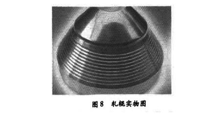 圖8是軋輥的實物照片, 可以看出:PSW三輥行星軋機的軋輥由10~20個變形區段組成的,每一個變形區段在瞬間完成變形一—定徑過程,最后由10~20個小變形區段組合成整體變形,完成整個變形過程,使道次變形率可達80%~95%以上,金屬的變形行為屬于點變形,與旋壓變形類似。