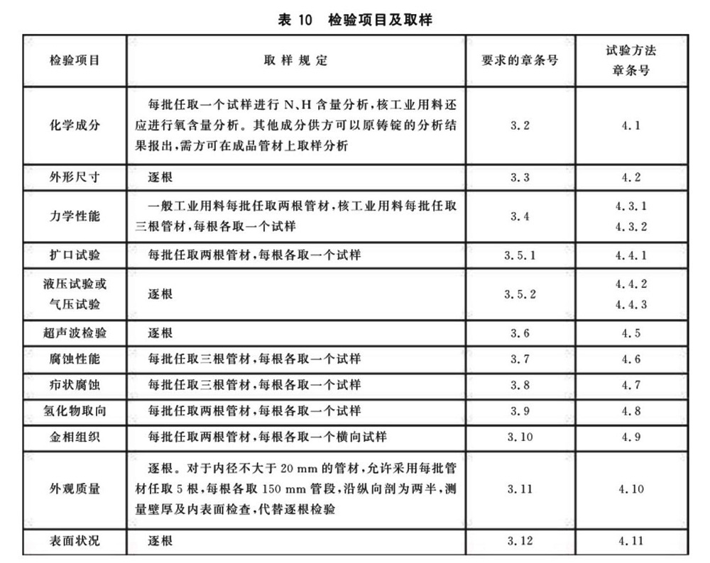 5.4.1 化學(xué)成分、力學(xué)性能、擴(kuò)口試驗(yàn)、腐蝕性能、癤狀腐蝕、氫化物取向及金相組織檢驗(yàn)中,如有一個(gè)試樣檢驗(yàn)結(jié)果不合格.則從該批取雙倍試樣對(duì)該不合格項(xiàng)目進(jìn)行重復(fù)試驗(yàn),如重復(fù)試驗(yàn)結(jié)果仍有一個(gè)試樣不合格時(shí),則判該批產(chǎn)品不合格。但允許供方逐根對(duì)不合格項(xiàng)目進(jìn)行檢驗(yàn),合格者交貨。