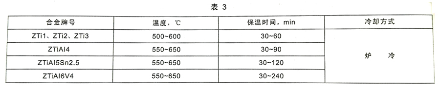 2.8.2 對形狀復雜,或使用條件苛刻的重要鑄件,需方要求并在合同中注明時,應在真空中進行消除應力退火處理。常用鑄造鈦及鈦合金消除應力退火處理制度可參照表3。其他合金的熱處理制度由雙方協商確定。