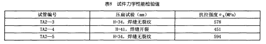 TA2—3、TA2—5試件壓扁試驗合格,TA2—4試件壓扁試驗不合格;TA2—3、TA—4、TA2—5試件抗拉強度值均高于標準值440~620MPa(GB/T3624),僅TA2—4試件抗拉強度值略高于其下限值。力學性能檢驗結果見表8。