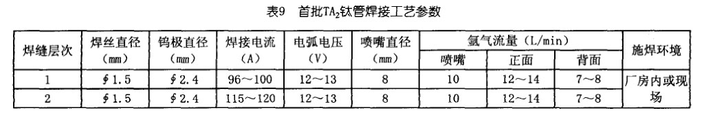 4.1.1 首批57X3mm鈦管對接共38道焊口,施焊中根據第二次焊接試驗結果制訂的焊接工藝參數見表9。
