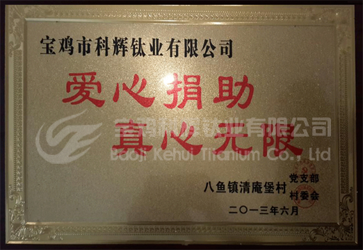寶雞市科輝鈦業(yè)有限公司,自創(chuàng)建以來,多次參與清庵堡村的失學兒童、孤寡老人愛心奉獻活動,公司以幫助他人 ,快樂自己 ,努力開拓的企業(yè)文化,于工業(yè)園區(qū)建立長期合作關系,深受清庵堡村黨支部領導關懷。2013年6月,獲得清庵堡村委會“愛心捐助 真心無限”榮譽稱號,公司將以此為契機,繼續(xù)開展愛心活動,做一個有責任的企業(yè)。