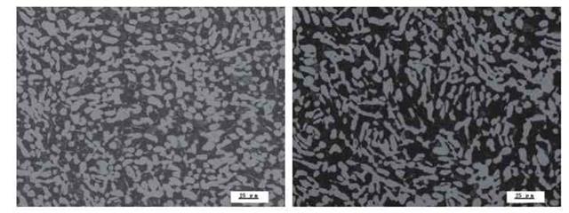 圖4為工藝路線2鍛制的φ75mm精鍛棒材高倍組織,由圖4可以看出金相組織分布較均勻,有等軸α相、長條α相,晶粒尺寸平均在13~50μm范圍內,α相含量約70%。