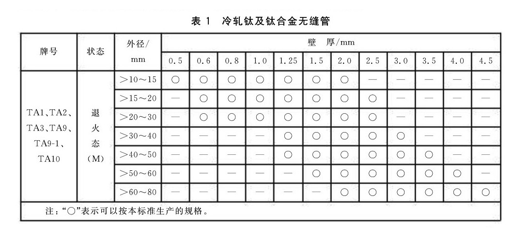 3.1.1.1 冷軋鈦及鈦合金無(wú)縫管的牌號(hào)、狀態(tài)和規(guī)格應(yīng)符合表1的規(guī)定。
