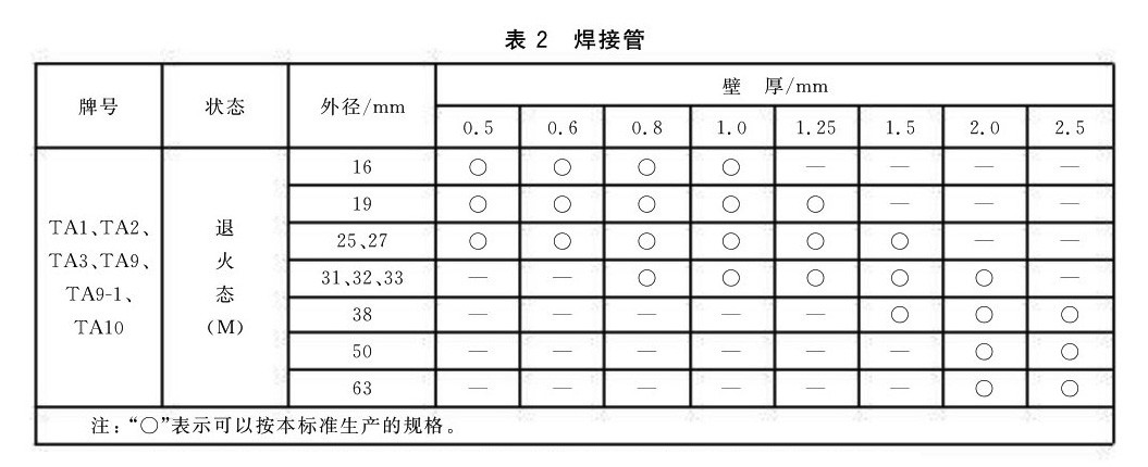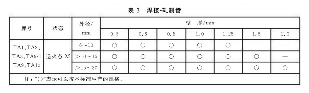 3.1.1.3 焊接-軋制法生產(chǎn)的鈦及鈦合金管的牌號(hào)、狀態(tài)和規(guī)格應(yīng)符合表3的規(guī)定。