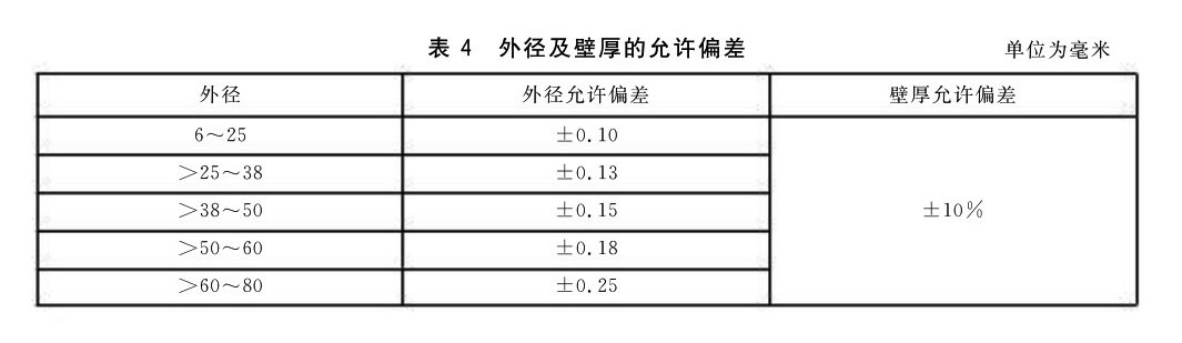 3.2.1 管材外徑及璧厚的允許偏差應(yīng)符合表4的規(guī)定,管材壁厚的允許偏差不適用于焊接管的焊縫處。