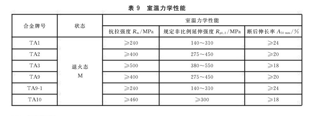 3.4.1 管材在供應(yīng)狀態(tài)下的室溫力學(xué)性能應(yīng)符合表9的規(guī)定,規(guī)定非比例廷伸強(qiáng)度R,在需方要求并在合同中注明時(shí)方予測(cè)試。