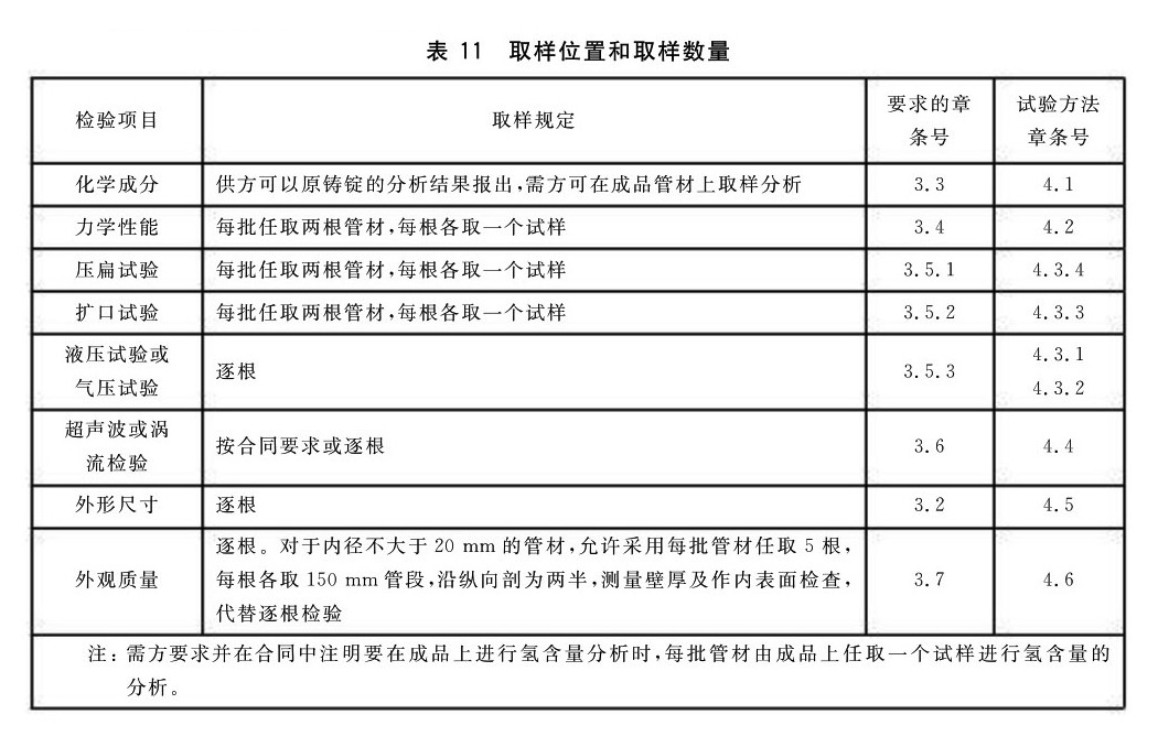 5.5.2 室溫力學(xué)性能檢驗(yàn)、壓扁試驗(yàn),擴(kuò)口試驗(yàn)中,如有一個(gè)試樣檢驗(yàn)結(jié)果不合格時(shí),則從該批取雙倍試樣對(duì)不合格項(xiàng)目進(jìn)行重復(fù)試驗(yàn),如重復(fù)試驗(yàn)結(jié)果仍有一個(gè)試樣不合格時(shí),則該批產(chǎn)品不合格,但允許供方逐根對(duì)不合格項(xiàng)目進(jìn)行檢驗(yàn),合格者重新組批。