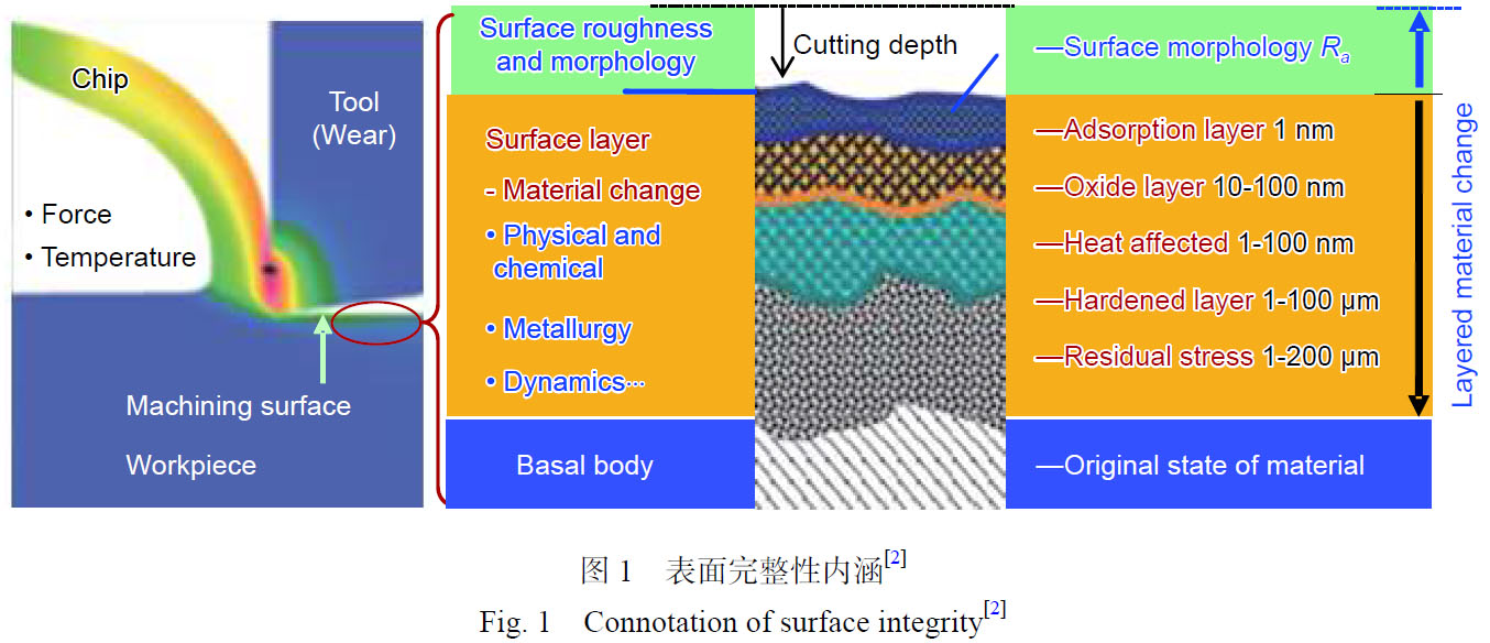 航空發(fā)動(dòng)機(jī)作為飛機(jī)的心臟,直接影響著飛機(jī)的性能、可靠性和經(jīng)濟(jì)性,是一個(gè)國家科技、工業(yè)和國防實(shí)力的重要體現(xiàn)。現(xiàn)有航空發(fā)動(dòng)機(jī)多采用高強(qiáng)度合金作為其主體結(jié)構(gòu)和主承力構(gòu)件,其服役能力的強(qiáng)弱取決于加工質(zhì)量。表面完整性已經(jīng)發(fā)展為描述、評(píng)價(jià)和控制零件加工過程在其加工表面和表層內(nèi)可能產(chǎn)生的各種表面狀態(tài)變化及其對(duì)該表面工作性能影響的技術(shù)指標(biāo)[1]。表面完整性是制造加工過程中構(gòu)件表面和表層材料可能產(chǎn)生的各種改變及其對(duì)構(gòu)件服役性能影響的總體描述和控制,主要包含表面形貌變化和表層材質(zhì)變化(如圖1所示[2])。表面形貌變化主要包括表面粗糙度、表面形貌/紋理、刀紋方向和裂紋、劃傷、雜質(zhì)等宏觀缺陷;表層材質(zhì)變化特征主要包括顯微結(jié)構(gòu)變化、再結(jié)晶、晶間腐蝕、熱影響區(qū)、顯微裂紋、硬度變化、塑性變形、殘余應(yīng)力等[3]。粗糙表面或機(jī)械加工引起的刀痕、缺陷等因素會(huì)引起很高的表面應(yīng)力集中,造成工作載荷應(yīng)力峰值高,直接成為疲勞源;潛伏在亞表層的微結(jié)構(gòu)和微力學(xué)的損傷缺陷將急劇加速疲勞裂紋的萌生和擴(kuò)展,加速疲勞失效;殘余壓應(yīng)力可以抑制疲勞裂紋的萌生而延長(zhǎng)疲勞壽命;提高表面顯微硬度值亦會(huì)抑制疲勞裂紋的萌生,但是會(huì)加速疲勞裂紋的擴(kuò)展。可見,疲勞壽命主要依賴于殘余應(yīng)力和表層微觀結(jié)構(gòu),殘余應(yīng)力松弛嚴(yán)重時(shí)表層組織晶粒細(xì)化對(duì)疲勞壽命影響占主導(dǎo)。
