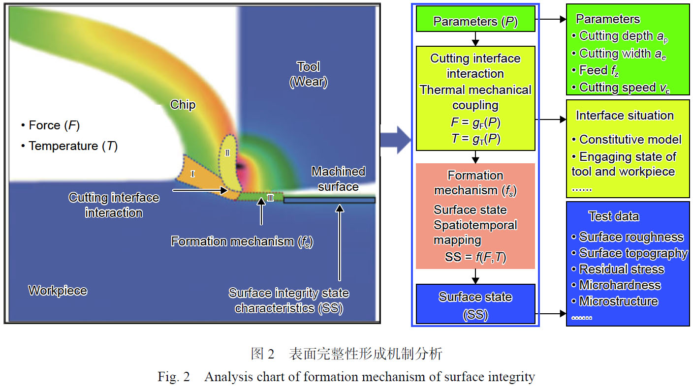表面完整性形成機(jī)制就是描述給定切削工藝因子與切削加工過程中的切削力和溫度,及最終產(chǎn)生的表面完整性狀態(tài)特征之間的關(guān)系及其影響機(jī)制。如圖2 所示,表面完整性形成過程主要包括兩個(gè)階段:第一階段為不同工藝因子下,產(chǎn)生不同的切削力F = gF(P)和切削溫度T = gT(P);第二階段為不同熱力耦合作用下產(chǎn)生不同的表面完整性狀態(tài)特征SS = f(F,T)。在表面完整性形成過程中,切削界面熱力耦合作用不僅受工藝參數(shù)、刀具條件、潤滑方式的影響,還受材料性能、刀具-工件嚙合狀態(tài)、輸出響應(yīng)信號(hào)監(jiān)測(cè)等界面復(fù)雜工況的影響。切削加工過程中的熱力耦合作用使得材料分別在變形區(qū)Ⅰ、Ⅱ、Ⅲ內(nèi)產(chǎn)生應(yīng)力、應(yīng)變,從而使工件表層及亞表層組織、成分、力學(xué)性能發(fā)生變化,未得到釋放的切削力和切削溫度轉(zhuǎn)變?yōu)樽冃文苁构ぜ砻娈a(chǎn)生大塑性變形,同時(shí)伴隨著工件表面不均勻的應(yīng)力和變形,構(gòu)成了殘余變形區(qū),殘余變形區(qū)的變形儲(chǔ)存能是加工表面微觀組織、加工硬化、殘余應(yīng)力形成的能量來源。