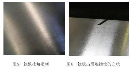 劃傷、輥痕、壓折是比較常見的機械性損傷缺陷,外觀表現為壓痕、劃傷,其形態各異,尺寸大小不一。劃傷的產生是導板、輥道以及工具不清潔,有棱角毛刺等(如圖5),軋制時劃傷表面。劃傷的問題如果不仔細檢查,在后續的生產中對零件的沖壓會造成開裂,如果是劃傷面積大且深度比較深,會直接導致零件的報廢。如輥痕的出現或導致鈦板出現連續性的凸狀,還有折疊的凹痕都是會造成鈦板的質量出現問題,(如圖6)。以上問題的出現是與軋輥表面的磨損有關系,磨損嚴重、板角被壓都會造成軋輥出現凹坑,如圖4)。
