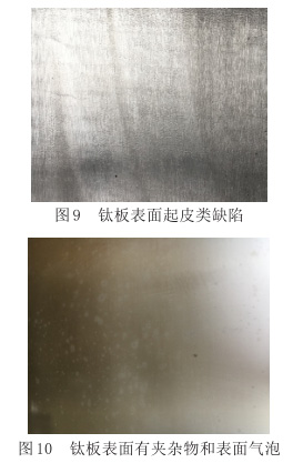 表面起皮類缺陷產生的主要原因是鈦板表面受到了夾雜物和表面氣泡的影響。道次加工率小,軋制道次過多,鈦板軋制的過程中,經過壓合作用,最后形成了表面起皮類缺陷。(如圖9圖10)。