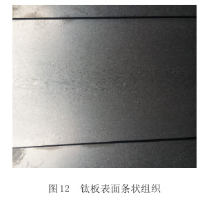表面粗精和條狀組織的出現出現是由于擠壓和鍛造所造成的,合金板坯在加工是沒有能夠達到加工率,在退火時的再結晶沒有充分形成,所以導致軋時出現此類問題(如圖11圖12)。解決此問題的方法記一下保證退火溫度達到要求,在進行開坯時要就要保證合金板坯足夠的變形,讓在結晶進行的更充分。