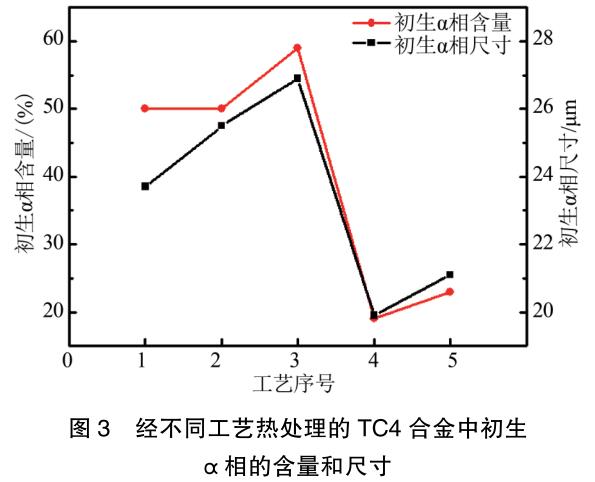 圖3為經不同工藝熱處理的TC4合金中初生α相的含量和尺寸。由圖3可知,隨著退火溫度的升高,合金中初生α相含量沒有變化,其平均直徑略有增大,與爐冷的合金相比,800℃空冷的合金初生α相晶粒較粗大。時效溫度從700℃提高至750℃,合金中初生α相含量提高了約21%,平均直徑降低了6%。固溶和時效處理的合金顯微組織中初生α相含量及平均直徑遠小于退火處理的合金。
