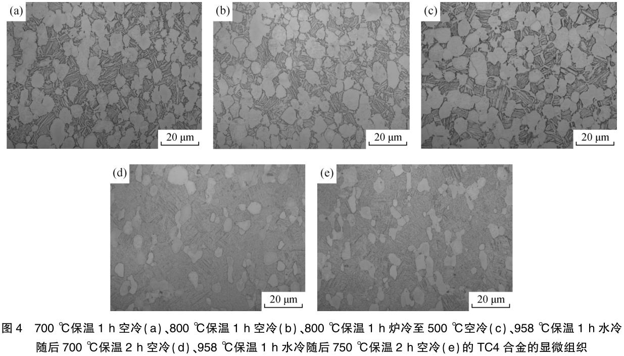 圖4為經不同熱處理工藝處理的TC4合金的顯微組織。普通工藝退火的TC4合金顯微組織為球狀α相+細小次生α′相+晶間β相;固溶和時效處理的合金則為球狀α+細條狀α相+固β相。固溶處理形成的亞穩定α相在熱力學上是不穩定的,時效加熱時將發生分解,分解產物為平衡態α+β。從圖4可以看出,退火態合金中初生α相含量較多,晶粒較粗大,且等軸化程度優于固溶+時效處理的合金。隨著時效溫度的升高,組織粗化,析出的α相含量增多尺寸增大。