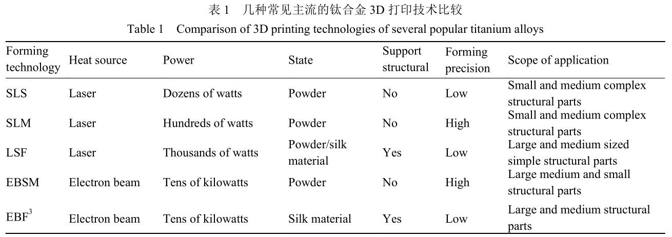 表 1 為幾種常見的鈦合金3D打印技術(shù)比較。