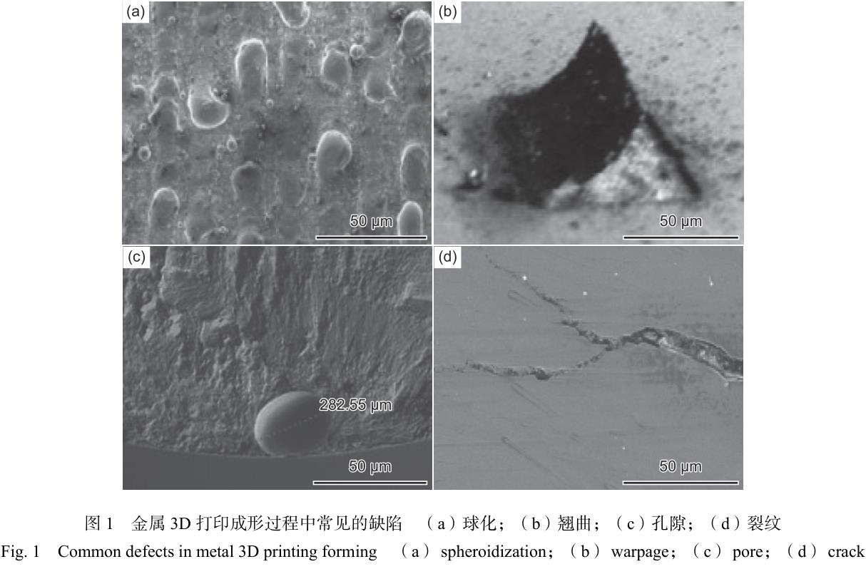 采用3D打印技術(shù)制備鈦合金,成功克服了使用傳統(tǒng)方法制備鈦合金結(jié)構(gòu)件時(shí),所面臨的費(fèi)用高、材料浪費(fèi)嚴(yán)重、加工工藝復(fù)雜,以及后續(xù)加工困難等不利因素,但采用3D打印技術(shù)成形鈦合金零件時(shí),由于粉末/絲材特殊的加工性能,或者工藝參數(shù)選擇不當(dāng),工件容易出現(xiàn)球化、裂紋、孔隙以及翹曲變形等缺陷。如圖 1 所示,嚴(yán)重影響鈦合金的機(jī)械性能和成形精度,阻礙了鈦合金3D打印技術(shù)的發(fā)展。另外,缺陷無損檢測是3D打印件能否實(shí)現(xiàn)廣泛應(yīng)用的基礎(chǔ),也是影響3D打印技術(shù)進(jìn)一步發(fā)展的決定因素。目前,國內(nèi)外對3D打印件缺陷進(jìn)行無損檢測的方法主要有[20-22]:滲透檢測、X 射線檢測、磁粉檢測和超聲檢測等。隨著3D打印件向結(jié)構(gòu)大型化、復(fù)雜化和精細(xì)化方向發(fā)展,傳統(tǒng)的無損檢測方法已經(jīng)不再適用于3D打印件的缺陷檢測和分析,新型的無損檢測技術(shù)工業(yè) CT 檢測和激光超聲在線無損檢測相繼問世。Plessis 等[23]采用 CT 技術(shù)檢測3D打印成形的復(fù)雜鈦合金結(jié)構(gòu)件,成功檢出了孔隙率僅為 0.005% 的微孔隙,這在采用常規(guī)無損檢測方法是幾乎不可能檢出的。國內(nèi)一專利[24]發(fā)明了激光超聲無損檢測技術(shù),利用激光激勵的超聲表面波幅的變化檢測3D打印過程中產(chǎn)生的缺陷,實(shí)現(xiàn)制造過程同步對零件進(jìn)行檢測。
