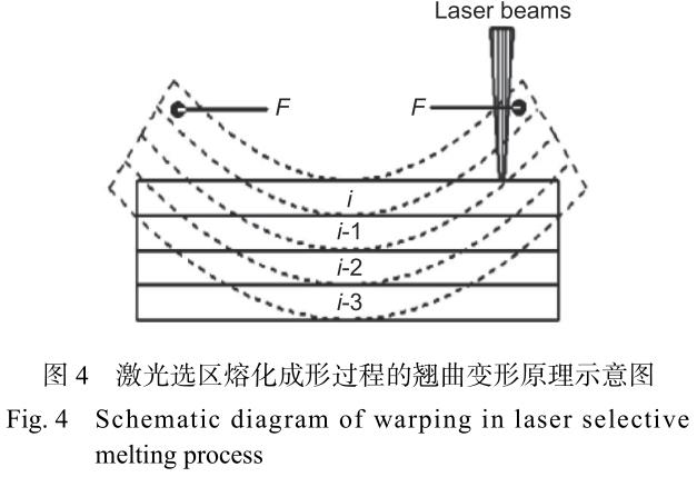 翹曲變形對成形件的尺寸大小、成形精度、形位誤差等的影響很大,甚至?xí)䥽?yán)重影響后續(xù)加工。國內(nèi)外針對鈦合金翹曲變形的研究較少。吳偉輝等[40]對成形過程中造成翹曲變形的成因進(jìn)行了研究,翹曲變形示意圖如圖 4 所示,可以看出激光作用的當(dāng)前層 (i) 層,受到高溫的作用處于塑性狀態(tài),在凝固過程中過快的冷卻速率,導(dǎo)致收縮變形;第 (i–1) 層溫度略低于第 i 層的溫度,此時(shí)塑性較差或處于彈性狀態(tài),在冷卻過程中,其收縮變形小于第 (i) 層的變形量,但是在第 (i) 層嚴(yán)重翹曲變形的作用下,第 (i–1) 層也會發(fā)生大幅度的向上翹曲變形。同理第 (i–2)、(i–3) 層也有相同的影響,只是距離 (i) 層越遠(yuǎn),對應(yīng)層的收縮量越小,當(dāng)距離 (i)層到達(dá)一定距離時(shí),對應(yīng)的層已不發(fā)生收縮變形,翹曲變形終止。齊海波等[41]采用電子束選區(qū)熔化成形TC4 鈦合金成形件,認(rèn)為掃描路徑對成形件溫度分布的影響,導(dǎo)致熱應(yīng)力分布不均勻是翹曲變形產(chǎn)生的主要原因。楊立寧等[42]通過建立數(shù)值分析模型,研究了在不同掃描路徑和堆積速率下,所對應(yīng)的熱應(yīng)力場分布和變化行為,以及它們對制件翹曲變形的影響。李守衛(wèi)等[43]分析了 SLS 技術(shù)成形過程中的溫度場與熱應(yīng)力場對翹曲變形的影響機(jī)理。