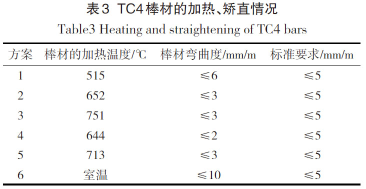 棒材的加熱溫度檢測采用手持式紅外測溫儀測量。每個方案中,隨機在同一批軋制的TC4鈦合金棒材中分別選擇10支棒材進行矯直試驗。