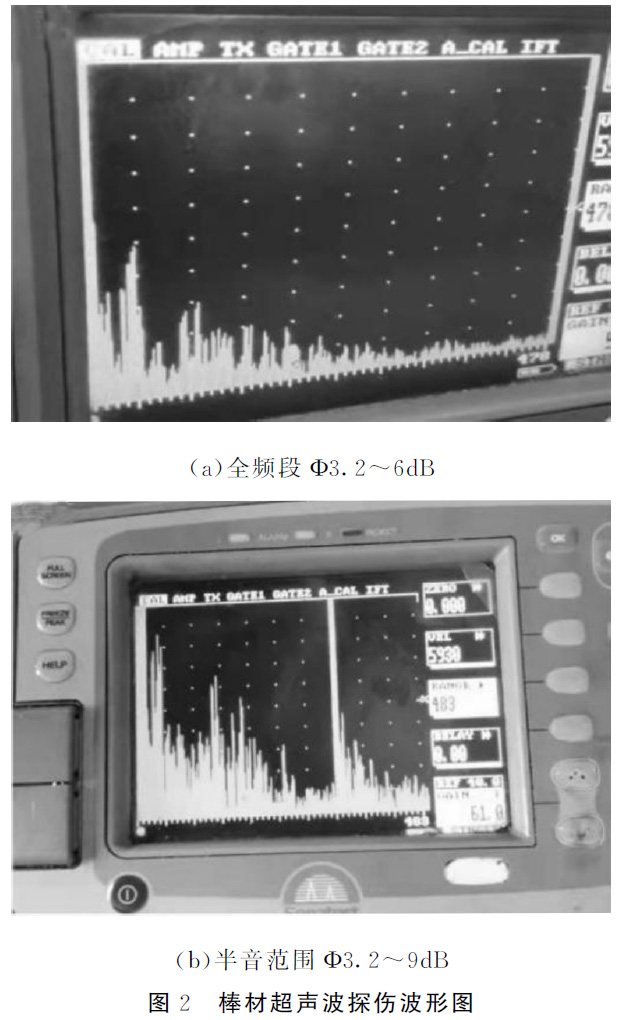對鈦合金棒材進行探傷分析,圖2為超聲波探傷波形圖,表1為棒材超聲探傷結(jié)果,其中Δd為整支棒材的底波噪聲差異,可以發(fā)現(xiàn),對于長度達2000mm的棒材來說,雜波能穩(wěn)定達到GB5193GB級水平,說明棒材的內(nèi)部組織均勻性較好。