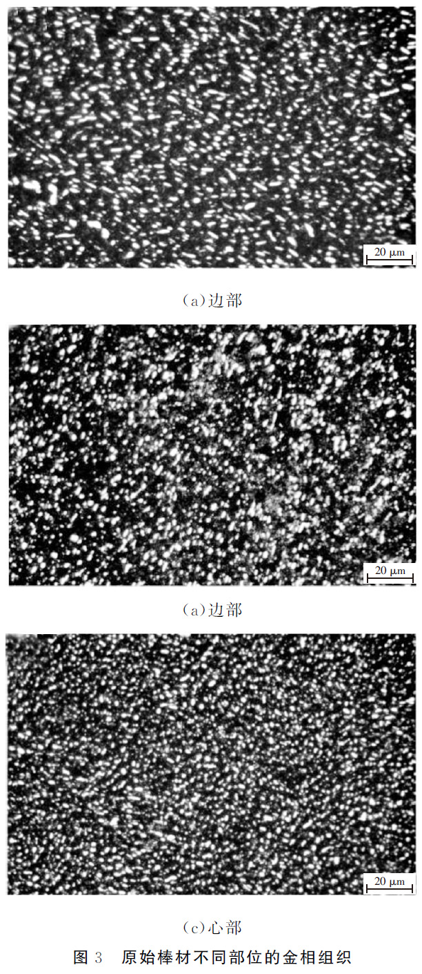 (1)經(jīng)探傷分析,原始棒材的雜波能穩(wěn)定達到GB5193GB級水平,其邊部、R/2部以及心部的金相組織包含大量初生α相,其晶粒十分細小且均勻,α相形貌為等軸狀形態(tài)。