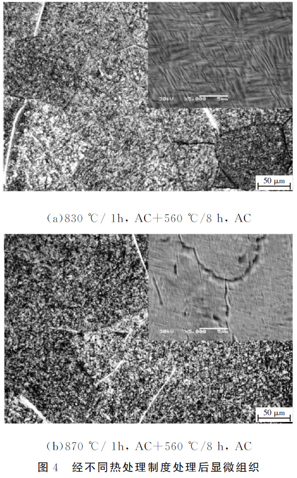 (2)經(jīng)不同熱處理制度處理后,顯微組織均以粗大的β晶粒為主,β晶粒內(nèi)部析出大量彌散分布的細小α相。
