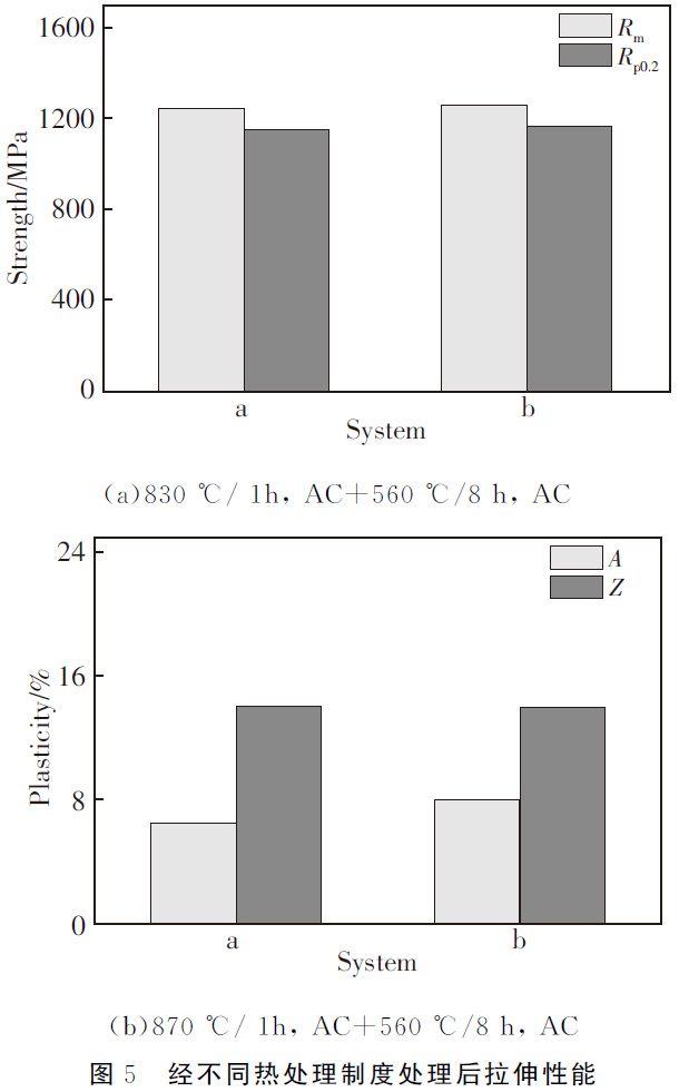 圖5為合金經(jīng)不同熱處理制度處理后的拉伸性能,可以發(fā)現(xiàn),合金的強度與塑性均較高,具有良好的強塑性匹配,且隨著固溶溫度的升高,合金的強度與塑性均有所升高,但塑性升高的幅度較低,相比之下,合金經(jīng)870℃/1h,AC+560℃/8h,AC處理后,其各項拉伸性能達到最佳值,為最佳熱處理制度,此時合金的抗拉強度(Rm)為1257MPa,屈服強度(Rp0.2)為1168MPa,斷后伸長率(A)為8%,斷面收縮率(Z)為14%。