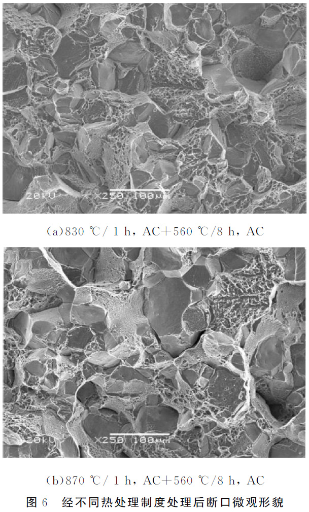 圖6為合金經(jīng)不同熱處理制度處理后斷口微觀形貌,由圖6可知,兩種熱處理制度下合金的斷口微觀形貌總體相似,均以巖石狀形貌為主,同時存在大量細小等軸狀韌窩分布在其表面,并可見明顯的撕裂棱,存在β晶界。這是由于經(jīng)兩種制度的熱處理后,組織均以包含粗大β晶粒,試樣在拉伸過程中,由于粗大β晶粒本身的具有較差協(xié)調(diào)性,在拉伸過程中易產(chǎn)生脆性斷裂,故形成巖石狀形貌。因為拉 伸時,組織中產(chǎn)生的裂紋并非在α相中形成,而是出現(xiàn)在發(fā)生塑性變形的β晶粒中,在拉伸不斷進行的過程中,其組織中會產(chǎn)生大量微孔,在微孔不斷長大以及增加的過程中,微孔會接觸相連,最終形成細小的韌窩分布在斷口表面[17]。由于斷口形貌中韌窩的數(shù)量以及尺寸能體現(xiàn)出合金塑性的大小,雖然圖6的形貌以巖石狀為主,但由于存在大量細小的韌窩,表明合金具有一定的塑性,這與合金的拉伸性能相符合。