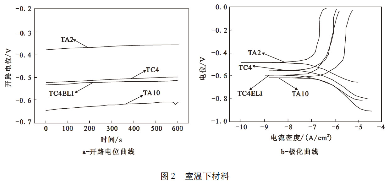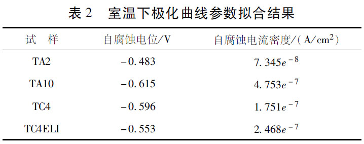 平穩(wěn)的趨勢。測試穩(wěn)定后,TA2開路電位最正,穩(wěn)定在-355mV附近,TC4與TC4ELI曲線較為接近,但TC4終值約為-4498mV,TC4ELI稍負,最終穩(wěn)定在-513mV附近,TA10開路電位最負,大約在-6610mV。由于合金元素分布情況在α相和β相中的含量不同,使兩相間之存在一定電位差,導致微電偶腐蝕發(fā)生的幾率較大,因此在室溫條件下,具有單相組織的TA2純鈦表現(xiàn)出更優(yōu)異的抗腐蝕性。