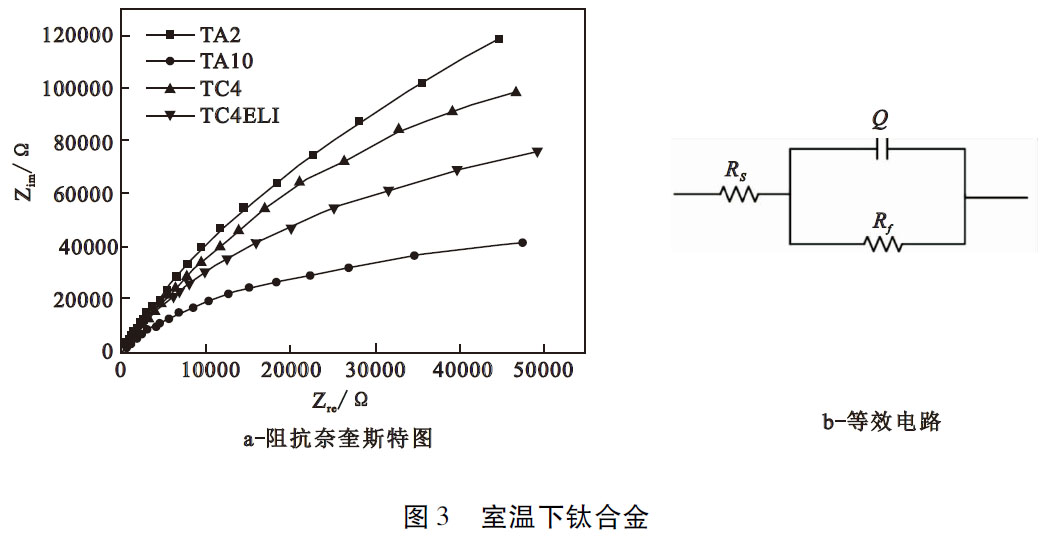 (1)在室溫實驗條件下,通過開路電位、自腐蝕電流密度及交流阻抗對比可知,耐腐性能TA2>TC4>TC4ELI>TA10。如果工況環(huán)境為室溫或接近室溫,工業(yè)純鈦TA2可作為較理想的坯料選擇對象。