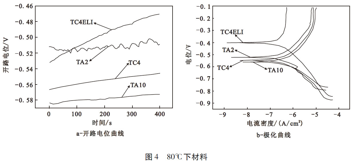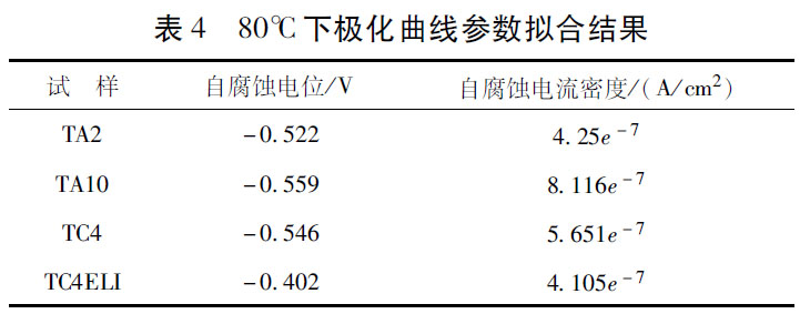 (2)當工況環(huán)境溫度升至高溫情況時,四類鈦材耐蝕性依次為TC4ELI>TA2>TC4>TA10。通常情況下,由于油氣井下工況條件多為高溫高壓腐蝕環(huán)境,此時選材可參照80℃下腐蝕性對比結果,即優(yōu)先考慮TC4ELI作為坯料材質。