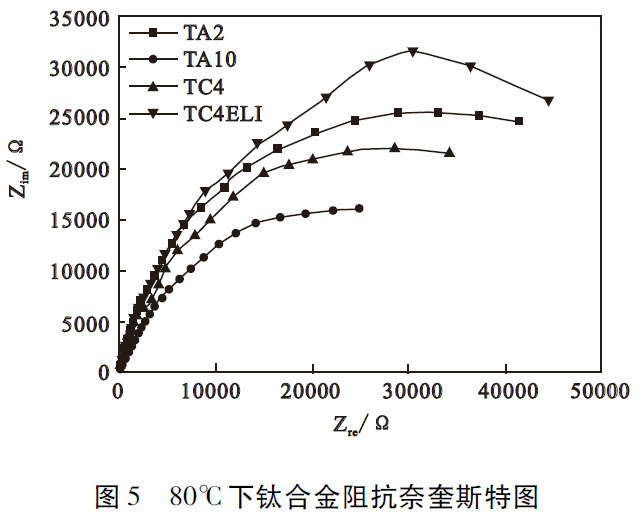 圖5為鈦合金在加熱腐蝕環(huán)境中的阻抗譜,雖然與室溫下阻抗譜有相似的單一容抗弧圖譜特征,但曲線峰值頂點卻比室溫狀態(tài)時有不同程度的降低。容抗弧半徑由大到小依次為TC4ELI、TA2、TC4、TA10。再次說明高溫腐蝕環(huán)境中的鈦及鈦合金容易進行電荷傳輸,對介質的抵抗能力更弱。