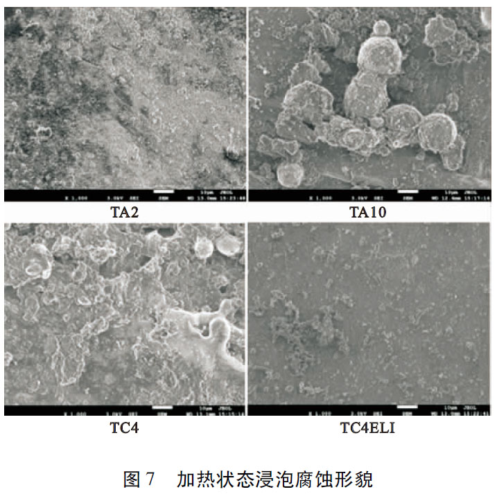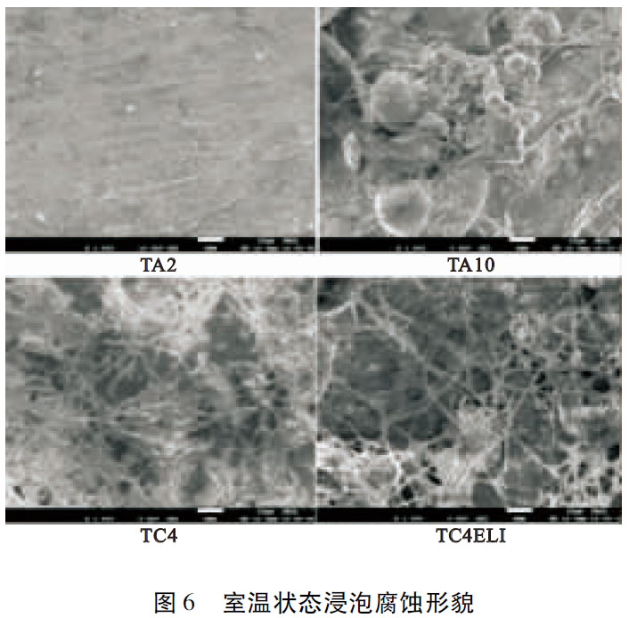 表內數(shù)據(jù)顯示的耐蝕性按TC4ELI、TA2、TC4、TA10的順序依次降低,這與室溫狀態(tài)有所區(qū)別。其中TC4ELI在加熱狀態(tài)耐蝕性優(yōu)于其他材料,可能是源于間隙元素和雜質元素的含量有所降低,這些元素與鈦原子的作用嚴重影響材料內部各相之間的價電子結構,同時對材料晶格產(chǎn)生影響甚至會出現(xiàn)內應力,從而影響系統(tǒng)穩(wěn)定性與宏觀理化性能,如耐腐蝕性、斷裂韌性等,但這些元素的具體作用原理和影響還需后期進一步研究確定。