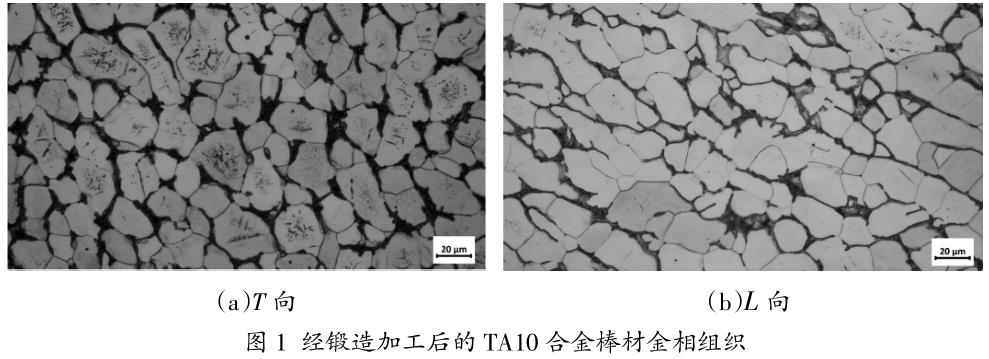 經(jīng)鍛造加工后的TA10合金棒材金相組織如圖1所示。由圖1可知,棒材的組織為典型的等軸組織,金相組織主 要由初生α相組成,初生α相形貌以等軸狀為主,同時組織中還包含β轉(zhuǎn)變組織,其位于初生α相之間,β 轉(zhuǎn)變組織包含次生α相及殘余β相。由圖1還可知,棒材的T向與L向金相略有差異,其中T向相比于L向的組 織中,其初生α相等軸化程度更高,均勻性更好,而L向的組織中,其初生α相形貌等軸化較差,有部分較 為粗大的初生α相。