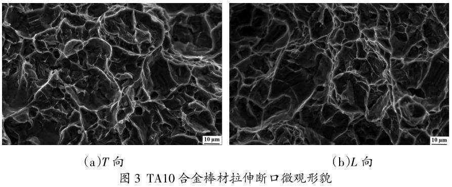TA10合金棒材拉伸斷口微觀形貌如圖3所示。由圖3可知,棒材T向與L向拉伸斷口微觀形貌幾乎一致,均是以 等軸狀韌窩為主,其中韌窩形貌與數(shù)量是體現(xiàn)合金塑性大小的主要依據(jù),當(dāng)韌窩數(shù)量較多且深時,棒材具有 較高的塑性值;當(dāng)韌性數(shù)量較少且淺時,合金具有較低的塑性值。韌窩的產(chǎn)生是由于棒材進(jìn)行拉伸時,較快 的應(yīng)變速率會使位錯在滑移過程中產(chǎn)生應(yīng)力集中,導(dǎo)致組織中的微孔發(fā)生形核,在拉伸不斷進(jìn)行過程中,位 錯運(yùn)動受到的排斥力降低,微孔內(nèi)會有少量位錯進(jìn)入,再次激活位錯源,因為棒材在塑性變形的過程中會不 斷形成新的位錯,導(dǎo)致微孔內(nèi)會連續(xù)不斷地進(jìn)入新形成的位錯,促使微孔生長,微孔不斷地匯聚在斷口處, 并且留下痕跡,最終形成韌窩[11]。在棒材的斷口微觀形貌中還發(fā)現(xiàn)少量的二次裂紋,這是因為組織中存在 β轉(zhuǎn)變組織,棒材在拉伸過程中,位錯運(yùn)動受到阻塞作用,導(dǎo)致位錯的運(yùn)動產(chǎn)生一定偏移所導(dǎo)致,同時在棒 材L向的斷口微觀形貌中有較為明顯的撕裂棱,撕裂棱的出現(xiàn)代表棒材的強(qiáng)度較大,這與棒材實際拉伸性能 一致[12]。