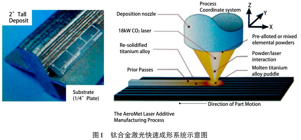 鈦合金激光快速成形技術(shù)以鈦合金粉末為原料,通過激光熔化/快速凝固逐層沉積“生長制造”,由零件CAD模型一步完成全致密、高性能鈦合金結(jié)構(gòu)件的“近凈成形制造”[8]。圖1為鈦合金激光成形系統(tǒng)示意圖。其具有加工周期短、制造成本低、柔性高、綜合性能優(yōu)異等特點,有望為航空航天領(lǐng)域的一些制造技術(shù)難題提供新的解決途徑[9]。