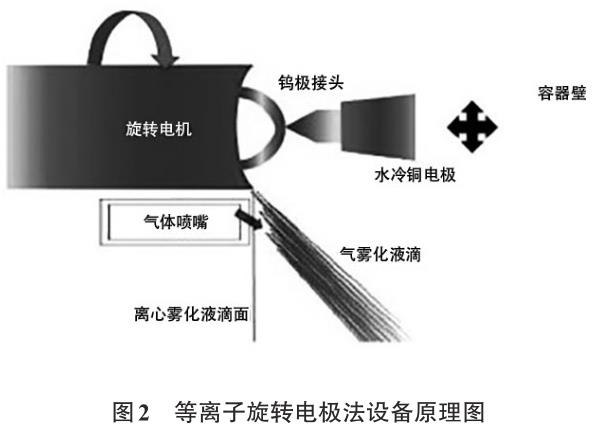 等離子旋轉(zhuǎn)電極法(PREP)是離心霧化法制取鈦合金粉末的主要方法之一[13-14]。先將鈦合金原材料制備成圓棒狀,利用等離子弧作為熱源持續(xù)熔化高速旋轉(zhuǎn)的鈦及鈦合金棒料端面,在10000~20000r/min的高速離心力作用下,將熔融的鈦合金液滴甩成滴霧狀,并在惰性氣體(Ar或He)的冷卻作用下快速凝固成球狀鈦合金粉末,如圖2所示。采用該工藝制備的鈦合金粉末的顆粒非常接近球形,粉末流動性好,間隙元素含量與原材料接近。但受到轉(zhuǎn)速的影響,等離子旋轉(zhuǎn)電極法只能制備粒度較大的鈦合金粉末,且生產(chǎn)效率低,生產(chǎn)成本高。