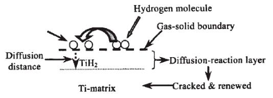 氫化脫氫工藝?yán)昧蒜?鈦合金)與氫在一定溫度下的可逆反應(yīng),其主要流程是鈦料-表面凈化處理-氫化-粉碎-篩分-脫氫-粉碎-篩分-混合-組批-真空封裝-商品鈦粉。先將鈦在一定溫度下氫化生成脆性氫化鈦后破碎成微細(xì)粉末,然后將氫在高溫真空條件下脫除,從而得到鈦(鈦合金)粉末。在氫化過程中,反應(yīng)是從外向內(nèi)單向進行的“吸附-擴散-反應(yīng)-再吸附-再擴散-再反應(yīng)”過程,且由于氫化過程中擴散層的存在(如圖4所示),當(dāng)原料尺寸較大時,原料內(nèi)部不能被氫化透,因此在大量吸氫反應(yīng)后,還需要相當(dāng)長的擴散時間才能使原料內(nèi)部得以充分氫化。在脫氫過程中,反應(yīng)是從物料表面向內(nèi)部逐漸進行的“反應(yīng)-擴散-脫附-再反應(yīng)-再擴散-再脫附”過程,且高溫下粉末容易燒結(jié)成塊,因此,在大量脫氫后,還需要相當(dāng)長的時間才能將氫脫除,而高溫脫氫時間的延長會進一步促進粉末的燒結(jié)成塊,為此必須增加一道破碎工序才能得到鈦(鈦合金)粉末。從氫化脫氫過程分析中可知,由于反應(yīng)中后期尤其是脫氫工序中后期反應(yīng)時間大大延長,使得能耗增加,生產(chǎn)周期變長,從而導(dǎo)致了粉末氧含量增加[20]。