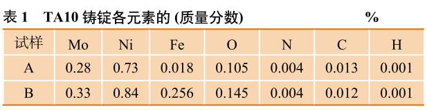 試驗采用新疆湘潤新材料科技有限公司生產的TA10鑄錠,按2種方案配料,經真空自耗電弧爐2次熔煉,熔煉完成后從鑄錠中部取樣,進行成分分析,各元素含量見表1,可以看出,試樣A中Mo、Ni、Fe、O等合金元素及雜質元素含量均較低,試樣B提高了主要合金元素和雜質元素的含量,引入較多量雜質元素的Fe。