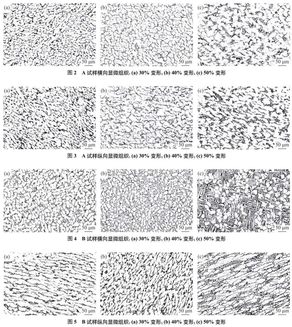 圖4和圖5分別為B試樣經相變點下不同鐓粗變形量生產鍛件的顯微組織,可以看出,B試樣鍛件初生α相晶粒更細小,并且無論變形量多少,初生α相晶界完整,這是由于β轉變組織中析出相對較多的次生α相,次生α相有明顯的長大趨勢,阻礙了初生α相的長大。