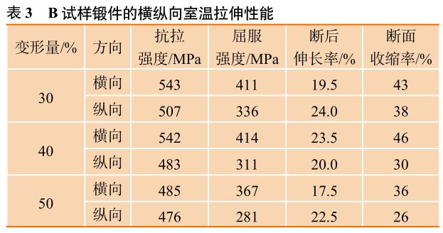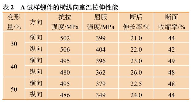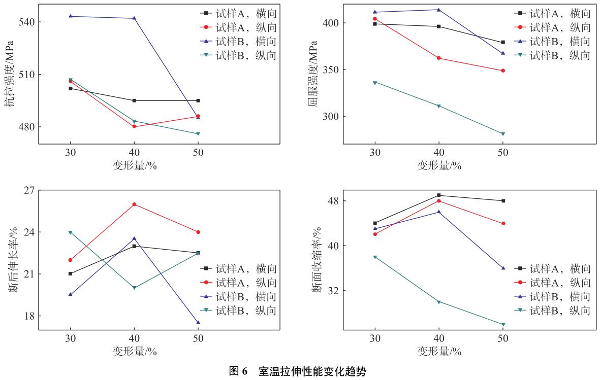 兩種試樣的橫、縱向室溫拉伸各項指標的變化趨勢見圖6,可以看出,A、B兩種試樣的鍛件強度隨變形量的增加而減少,塑性指標A試樣明顯高于B試樣,但B試樣在小變形量下的橫向強度、塑性均達到最高,各向異性明顯。