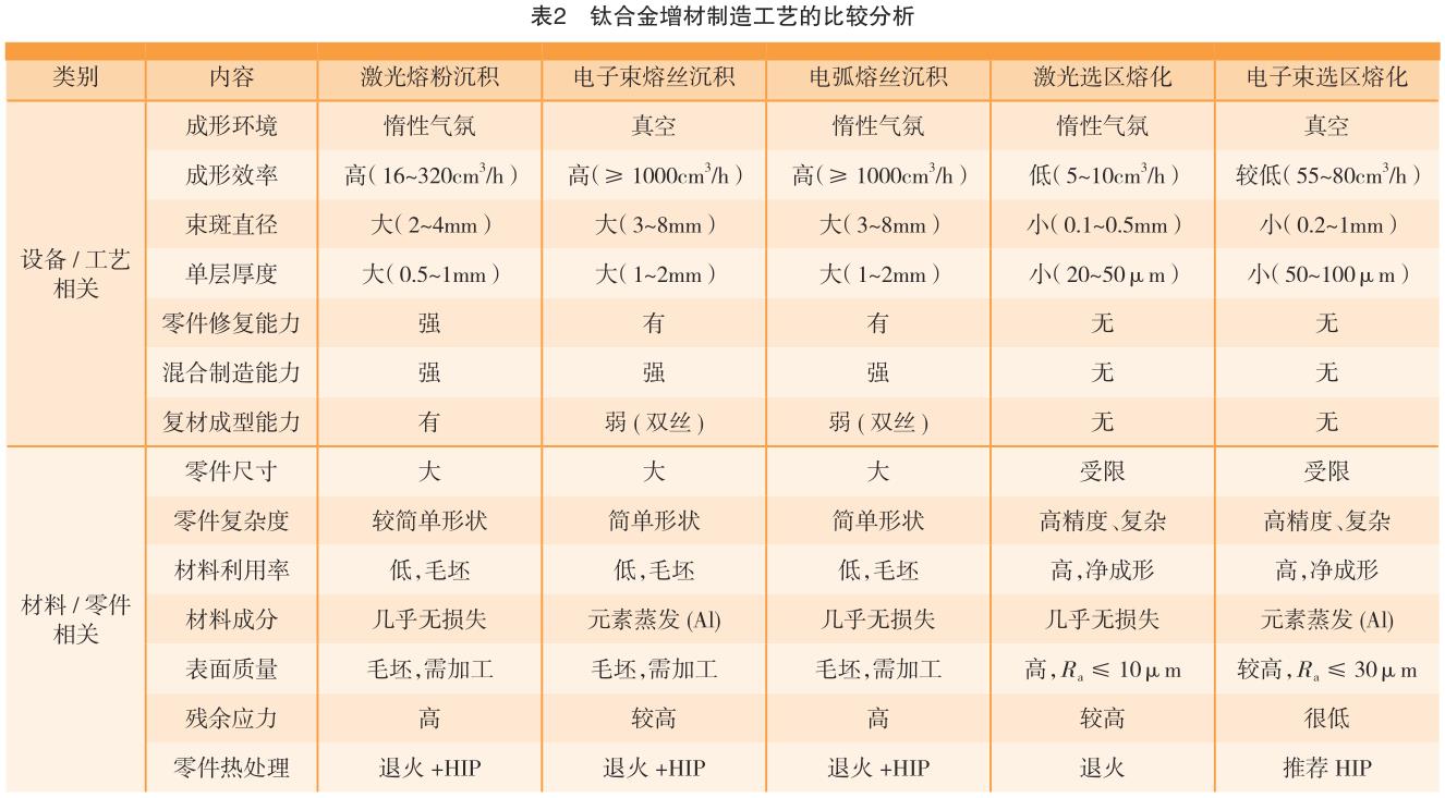 鈦合金的增材制造可分為直接能量沉積與粉末床熔化兩個技術類別,再根據熱源的不同,如今形成了激光熔粉沉積(Laser MetalDeposition, LMD)、電 子 束 熔 絲 沉積(Electron Beam Wire Deposition,EBWD)、電 弧 熔 絲 沉 積(Wire ArcAdditive Manufacturing, WAAM)、激光選區熔化(Selective Laser Melt-ing, SLM)、電子束選區熔化(ElectronBeam Melting, EBM)5 種主要方法(表1)。