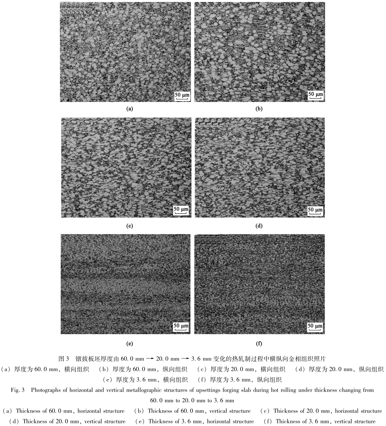 軋制采取相同的工藝來進行,確保對比的有效性。使用Φ2800mm四輥可逆熱軋機,將厚度為170~180mm的板坯在940℃下軋制成厚度為50~60mm的板坯。