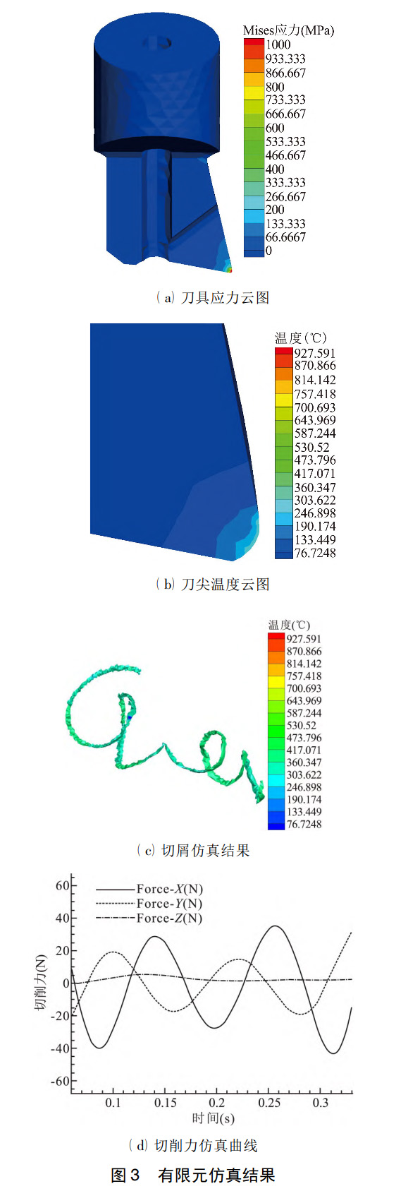 根據(jù)有限元仿真的結(jié)果對單刃鏜刀加工鈦合金孔的切削狀態(tài)進(jìn)行分析。圖3a為刀具應(yīng)力的分布云圖,可以看出刀具的應(yīng)力主要集中在刀尖處。同時,刀頭與頸部的連接處也是應(yīng)力比較集中的位置。