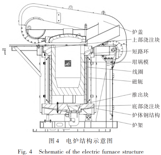 電爐是真空熔煉的核心設(shè)備之一(圖4),它直接影響熔煉過(guò)程中金屬的加熱和冷卻。合理設(shè)計(jì)電爐結(jié)構(gòu),確保金屬樣品受熱均勻是非常關(guān)鍵的。先進(jìn)的電爐控制系統(tǒng)可通過(guò)精準(zhǔn)控制溫度,確保金屬在熔化和凝固過(guò)程中的溫度穩(wěn)定性[15]。冷卻速率直接影響晶體的生長(zhǎng)速度和晶格結(jié)構(gòu)。通過(guò)調(diào)整冷卻速率,可以控制金屬晶體的尺寸和形狀,從而改善金屬材料的力學(xué)性能和結(jié)構(gòu)均勻性[16]。高度可控的冷卻速率是真空熔煉技術(shù)的一項(xiàng)關(guān)鍵工藝參數(shù)。