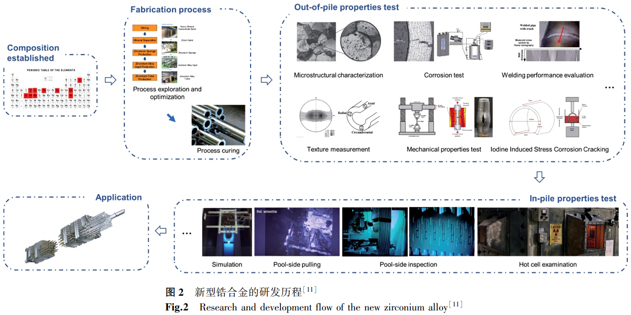 德國化學家馬丁.海因里希.克拉普羅斯于1789年首次發(fā)現了鋯元素。1824年,瑞典化學家喬斯.雅各布.布雷澤利烏斯通過在鐵管中混合加熱鉀和氟化鋯,在實驗室中分離出這種金屬。直到1925年,荷蘭化學家A.E.vanArkel和J.H.deBoer才發(fā)明了一種碘化物工藝來熱分解四碘化鋯,并生產出更純的金屬鋯。這種韌性金屬被稱為碘化金屬或晶體棒,具有良好的延展性,可以冷加工。當時,大多數生產的金屬用于電子工業(yè)的吸氣和真空管部件,但工藝昂貴,供應有限。到1948年,只有幾噸被用于工業(yè)生產中。20世紀40年代末,美國率先研究了鋯在水冷反應堆中的應用,之后俄羅斯、法國、德國等國自20世紀50年代起先后研發(fā)出一系列鋯合金。1951年,美國科研人員通過利用Sn元素吸收鋯合金中的有害元素,研發(fā)出了Zr-2.5Sn合金,即Zr-1合金,然后調整元素組成研制出具有優(yōu)良綜合性能的Zr-2合金,并用作世界第一艘核潛艇的核燃料包殼材料,后來又加以改進研制出Zr-4合金,一直沿用至今[4]。為了解決Sn元素含量較高導致鋯合金耐腐蝕能力無法進一步提高的問題,隨著冶煉技術的提高,人們通過控制Sn元素含量并提高其中的鐵和鉻的含量對Zr-4合金進行了改進。此外,Zr-Nb系合金也得到了世界各國的關注,如加拿大開發(fā)了Zr-2.5Nb合金[5],前蘇聯(lián)研制了E110等系列鋯鎳合金[6]。近年來,隨著工業(yè)化的發(fā)展和技術水平的提高,各種高性能新型鋯合金也不斷被研發(fā)出來,如美國的Zirlo合金[7]、日本的抗腐蝕新合金(NDA)[8]、前蘇聯(lián)的E635合金[9]、法國的M5合金[10]等。新型鋯合金的研發(fā)歷程如圖2所示[11]。