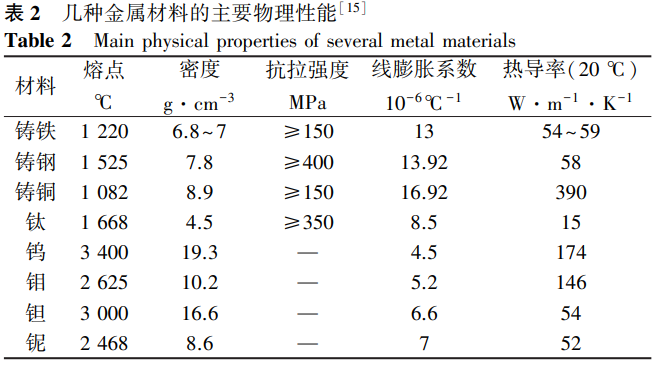 目前可用作鑄型材料的金屬主要包括鑄鐵、鑄鋼、鑄銅以及部分難熔金屬,其主要物理性能見表2[15]。