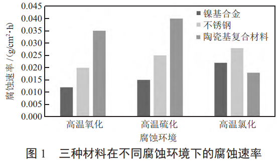 可以看出直觀的數(shù)據(jù)對比,鎳基合金在高溫氧化和高溫硫化環(huán)境中展現(xiàn)了較強的抗腐蝕能力,這與其優(yōu)異的高溫穩(wěn)定性和較高的耐硫化性有關(guān)。陶瓷基復(fù)合材料在高溫氯化環(huán)境中表現(xiàn)優(yōu)異,表明其表面結(jié)構(gòu)對氯化物的防護作用較強。相比之下,不銹鋼在所有腐蝕環(huán)境中表現(xiàn)較為平庸,尤其是在高溫硫化和氧化環(huán)境中,其耐腐蝕性較弱,這是由于鋼基材的脆弱性以及表面鈍化膜的損耗。